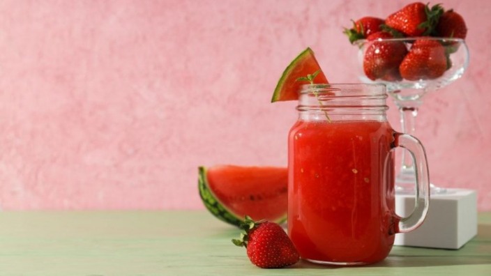 نضع الفراولة ومكعبات البطيخ والنعناع ومكعبات الثلج في خلاط كهربائي ونخلط حتى نحصل على مزيج ناعم.