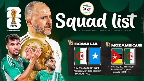 استدعى مدرب المنتخب الوطني الجزائري، جمال بلماضي، 23 لاعبا، تحسبا لمواجهتي الصومال يوم الخميس 16 نوفمبر 2023 (سا00، 18)، بملعب نيلسون مانديلا ببراقي (الجزائر العاصمة)، والموزمبيق يوم الأحد 19 من نفس الشهر بملعب زمبيتو مابوتو (سا 00، 14) ضمن الجولتين الأولى والثانية للمجموعة السابعة من التصفيات المؤهلة لكأس العالم 2026.