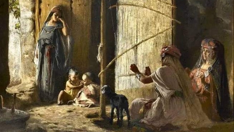 في إحدى اللوحات يصور بريدجمان جانبا من أنشطة الحياة اليومية في فناء منزل ريفي زاره في ولاية بسكرة المشهورة بصناعاتها اليدوية وبساطة الحياة فيها، وتظهر امرأتان تقومان بأعمال التطريز بصحبة امرأة ثالثة وخادمة سمراء، والمرأة الجالسة أمام طاولة النسيج تعالج الخيط، بينما تراقبها الفتاة الصغيرة باهتمام، وخلفهما تقف فتاة أخرى تمسك بباقة أزهار، وإلى اليسار مائدة مذهبة عليها عنب وتين، وفي الخلف يمكن رؤية غزالة تستريح تحت الجدار، والرسّام يضمنها في اللوحة باعتبارها رمزا لجمال المرأة في الثقافة الجزائرية والعربية، وهناك أيضا نافورة وعمود من الرخام ذو طراز أنيق.