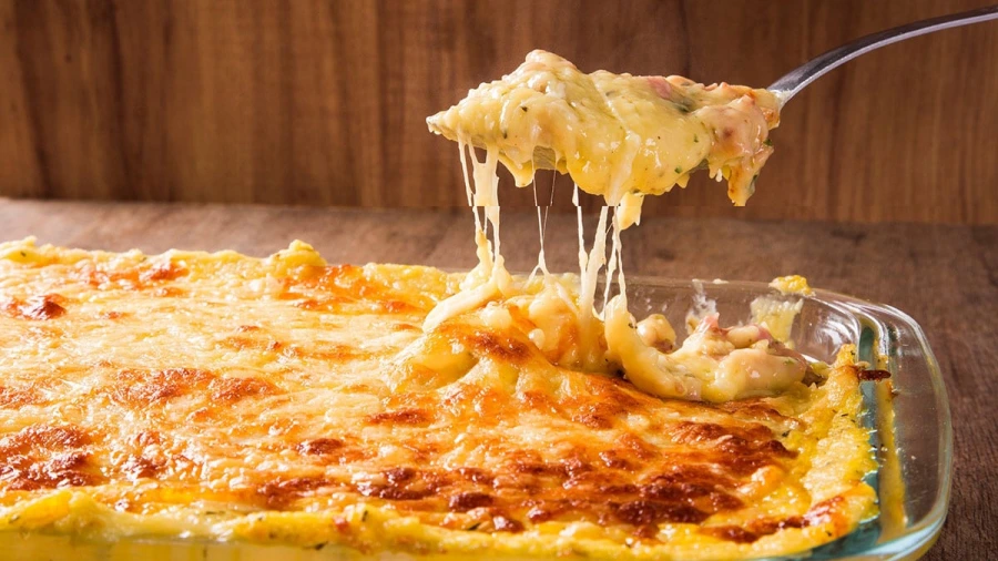في إناء نحضر بيشامال خفيفة القوام نوعا ما بوضع ملعقة الزبدة تذوب ثم نضيف الفرينة، تحمص مع الزبدة جيدا، ثم نضيف الحليب دون التوقف عن التحريك حتى تثقل البيشامال حينها نضيف الملح والفلفل الأسود والجبن الأبيض ونطفئ النار. في إناء غميق نضع كل من الدجاج والبصل مع الفطر والجبن المبشور والبيشامال ونسكب الكل في صحن يدخل الفرن مدهون بقليل من الزبدة وندخله الفرن مسخن مسبقا وفي آخر 5 دقائق نخرجه، نضيف الجبن المبشور على الوجه مع كمية قليلة من الشابلور وندخله ليحمر من الأعلى فقط.