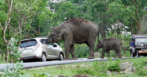 التقط أحد المصورين مجموعة صور لفيل هندي جائع يلتهم حقيبة سائحة توقفت مع ابنها لالتقاط صورة “سيلفي” معه، في حديقة بانديبور الوطنية في الهند.
