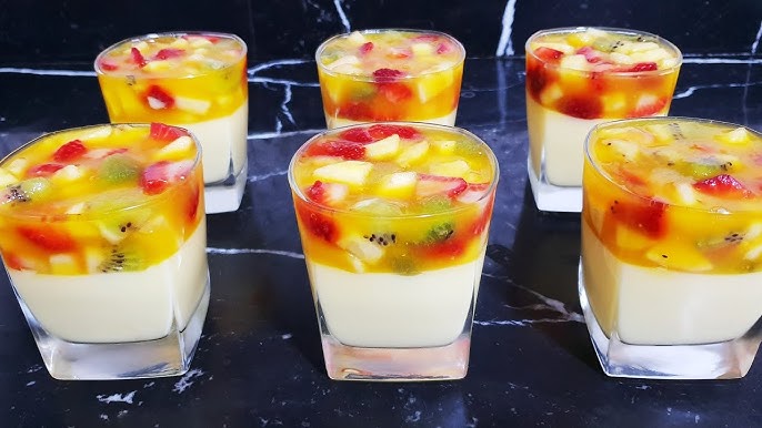 - في كأس توضع قطعتي جينواز، تزين بسلطة الفواكه ثم تغطى بطبقة من الياغورت وطبقة من الفواكه المطحونة.