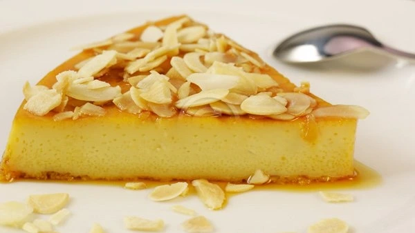 - تقلب الكريمة مباشرة في طبق التقديم ثم تزين برقائق اللوز.