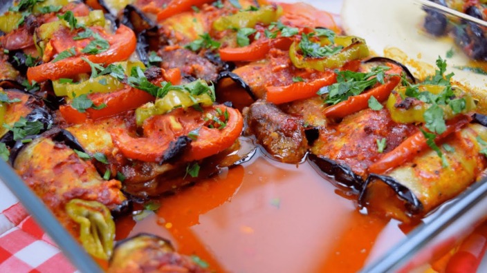 - نوزع المزيج على الشرائح بمقدار ملعقة طعام لكل شريحة باذنجان، نلف الشريحة ونثبتها بعود أسنان.