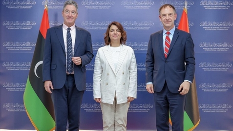 واستقبلت وزيرة الخارجية بحكومة الوحدة الليبية، نجلاء المنقوش، المبعوث الألماني الخاص إلى ليبيا، كريستيان باك، برفقة السفير الألماني لدى ليبيا، ميخائيل أونماخت، في مقر الوزارة بطرابلس، بحسب بيان لوزارة الخارجية الليبية، الاربعاء.