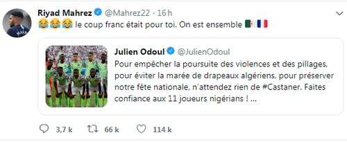 ورد محرز صاحب هدف فوز منتخب بلده على نيجيريا، حيث كتب على حسابه الرسمي في التويتر: “هذه الركلة الحرة مهدية لك يا جوليان أودول، نحن معا”، مرفقا التغريدة بعلم الجزائر وفرنسا.