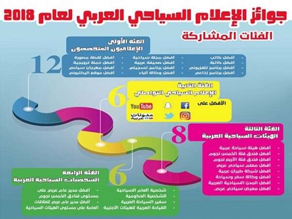 وحصلت وكالة أنباء البحرين على جائزة أفضل وكالة أنباء عربية، فيما حصل المصور محمد اليافعي من قطر على جائزة أفضل لقطة مصورة وفاز برنامج “بساط الريح” من السودان بجائزة أفضل برنامج إذاعي وفاز بأفضل موقع سياحي إلكتروني موقع السائح العربي وحصل برنامج “على خطى العرب” من السعودية على جائزة أفضل برنامج تليفزيوني.