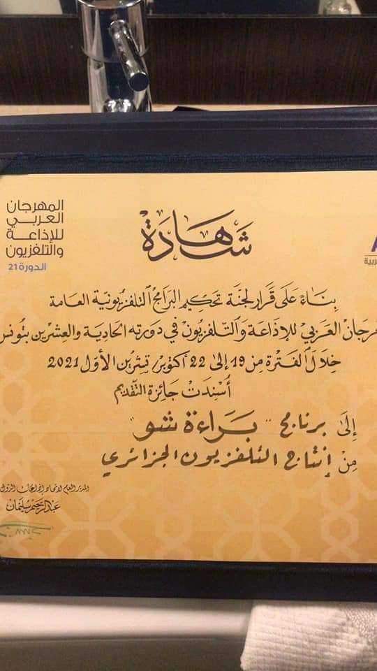 المهرجان العربي للإذاعة والتلفزيون الذي ينظمه كل سنة اتحاد إذاعات الدول العربية بتونس، نظم هذا العام (2021) الدورة الـ 21 منه، حيث كان لنا الحظ أن شاركنا ببرنامج “براءة شو” فكرتي وإعدادي وهو برنامج خاص بالطفولة وفزنا بجائزتين وهما الجائرة الثانية في فئة برامج الأطفال لبرنامج “براءة شو” وكذلك لجنة التحكيم قدمت جائزة الإبداع في التقديم للمنشطين الأربعة لبرنامج “براءة شو”.