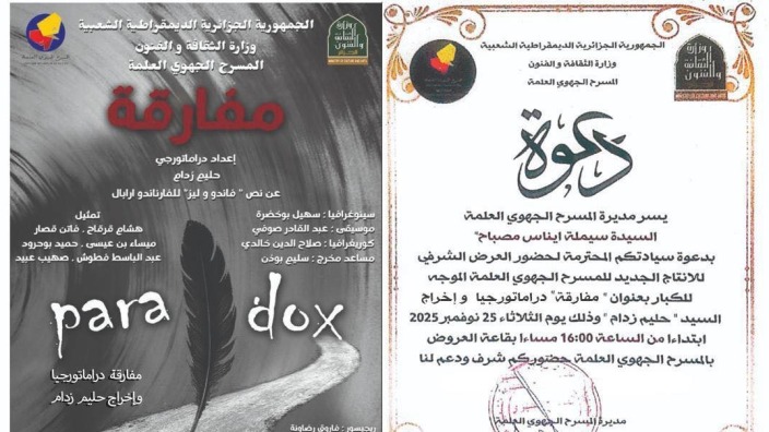 سيكون المسرح الجهوي للعلمة، مساء اليوم الثلاثاء، على موعد مع العرض الأولي لمسرحية “مفارقة” التي اقتبسها وأخرجها حليم زادم وستكون حاضرة بالمهرجان الوطني للمسرح المحترف.