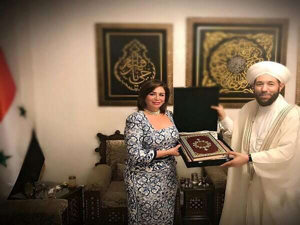 ونشرت إلهام صورة لها عبر حسابها على انستغرام، وهي تتسلم مصحفا هدية من مفتي النظام السوري أحمد بدرالدين حسون.