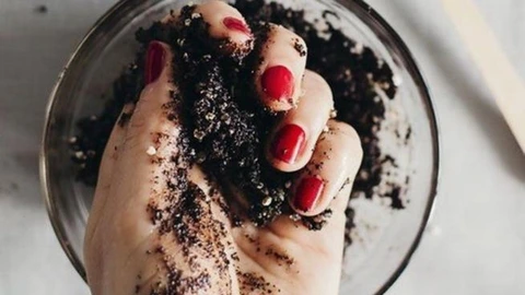 ضع نصف كوب من القهوة المطحونة، وربع كوب من زيت جوز الهند.