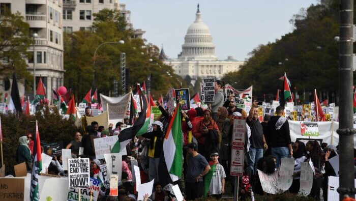 تجمع عدد من المناصرين للقضية الفلسطينية أمام البيت الأبيض، للاحتجاج على استضافة الرئيس الأمريكي دونالد ترامب، رئيس الوزراء “الإسرائيلي ” بنيامين نتنياهو.
