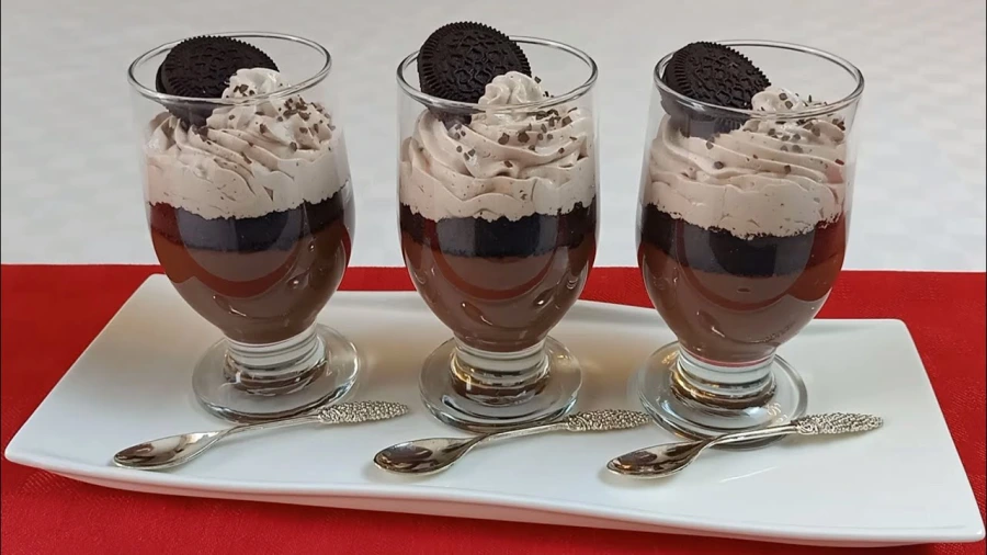 في إناء نضع كل مكونات موس الشكلاطة ماعادا شكلاطة الطلي نحرك جيدا ونضعها فوق النار ونتركها حتى تثقال مع التحريك المستمر، نزيلها من على النار ونضيف لها ملعقة كبيرة من شكلاطة الطلي ونمزج جيدا قبل ملء الكؤوس ننزع حوالي ملعقتين كبيرتين من الموس ونتركها جانبا لمزجهما مع الشانتيي ثم نملأ كؤوس التقديم للنصف ثم نقوم بوضع طبقة متمثلة في ملعقتين صغيرتين من البيسكوي المطحون بكل كأس ثم نضع الكؤوس بالثلاجة حتى تبرد تماماذك