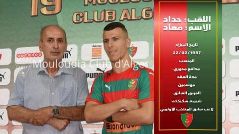 أصبح المدافع الأوسط لشبيبة سكيكدة، معاذ حداد، أول لاعب تستقدمه مولودية الجزائر خلال فترة الانتقالات الصيفية، بعد توقيعه لعقد مدته موسمين، حسب ما أعلن عنه نائب بطل الجزائر لكرة القدم على صفحته الرسمية فايسبوك.