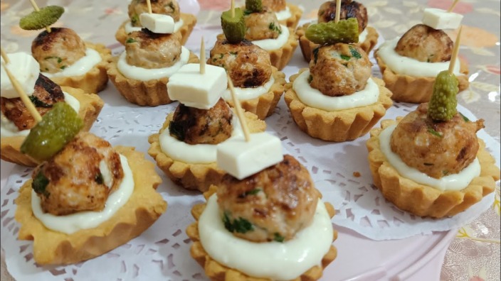نضع كريمة الجبن بعد خفقها جيدا بالفوي بكيس حلواني نملأ قاعدة الترتات ناخد كرات الدجاج المقلية نثبت فوقها مكعبات الجبن او زيتون او طماطم كرزية او كورنيشو بواسطة اعواد التثبيت وتوضع فوق الكريمة