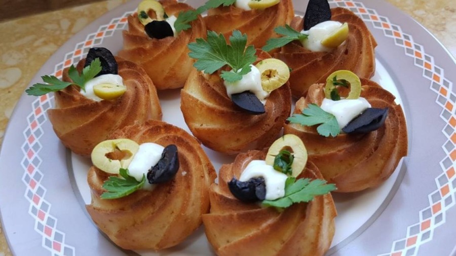 نملأ فراغات أو التجويفات الموجودة بالميني كايك بكريمة الجبن وتزين بحبات الزيتون الأخضر والأسود والبقدونس.
