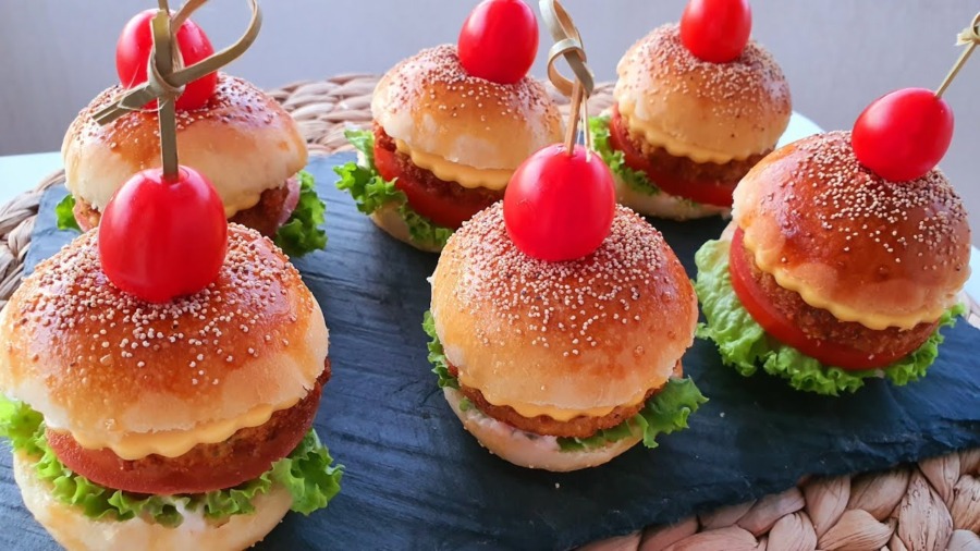 بواسطة سكين منشاري نفتح الخبيزات ناخذ الجزء السفلي ندهنه بخليط المايوناز والكاتشاب نضيف الخس وبعدها الطماطم ثم الدجاج ويليه شريحة الجبن ثم نضع فوقه الطبقة العلوية من الخبز. نقوم بتزيين الميني همبرغر بالطماطم الكرزية أو بالزيتون