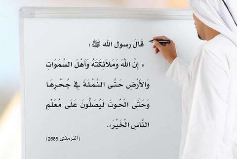 عن أبي أمامة رضي الله عنه أن رسول الله صلى الله عليه وسلم قال: “فضل العالم على العابد كفضلي على أدناكم”، ثم قال رسول الله صلى الله عليه وسلم: “إن الله وملائكته، وأهل السموات والأرض، حتى النملة في جحرها، وحتى الحوت ليصلون على معلمي الناس الخير” رواه الترمذي. ففي هذا الحديث دلالة على أن فضل العالم على العابد كبير جداً، وفضله كفضل النبي صلى الله عليه وسلم على غيره من البشر، والمعيار الأوحد هو العلم وليس إلاَّ العلم، لأن العالم هو الذي ينوّر للعابدين طريقهم إلى الله سبحانه وتعالى، وهو الذي يحذرهم من مكائد الشيطان ومكره، وتبيان الطريق الصحيح منوط بأهل العلم، لهذا تميز العالم عن العابد بهذا المعيار.