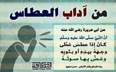 – عند العطاس يضع يده أو ثوبه على فمه ويخفض صوته: روى أبو داود والترمذي – وصححه – عن أبي هريرة رضي الله عنه ” أن النبي صلى الله عليه وسلم كان إذا عطس غطَّى وجهه بيدِه أو بثوبه، وغَضَّ بها صوته”.