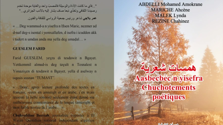 صدر بثلاث لغات هي العربية والأمازيغية والفرنسية عن دار النشر “آرت بلوم” أو ريشة الفن، ديوان شعري ثمرة عمل أدبي مشترك جمع الشعراء والشاعرات على غرار أحسن مريش، عبدلي محمد أمقران، ليندة مالك وشهيناز رزين، في عشرين نصا حول مواضيع شتى، منها، التضحية، النضال، التاريخ، القضية الفلسطينية، حب الوطن، الأمل، مواضيع الحياة والوجود، الذات الإنسانية في تقلباتها.