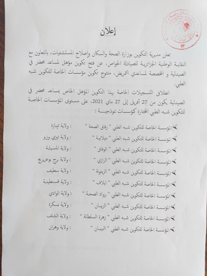 أعلنت وزارة الصحة، في بيان لها، أن مديرية التكوين بالوزارة فتحت تكوين مؤهل لمساعد محضر في الصيدلة، والمخصصة لمساعدي التمريض ومنتوج تكوين مؤسسات خاصة لشبه الطبي.