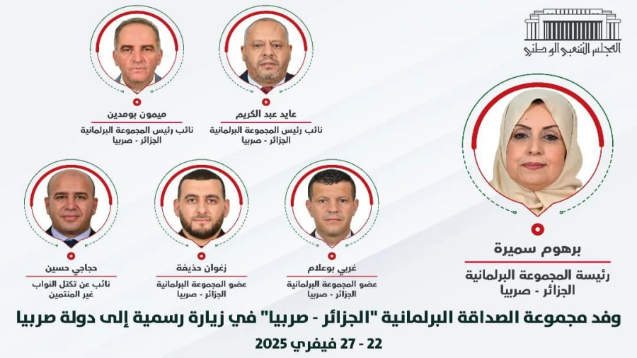 وأوضح نفس المصدر, أن “وفدا من المجموعة البرلمانية للصداقة الجزائر-صربيا, برئاسة السيدة برهوم سميرة, رئيسة المجموعة, يقوم بزيارة رسمية إلى جمهورية صربيا خلال الفترة من 22 إلى 27 فيفري الجاري”.