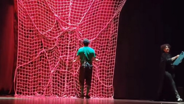 وتجري الأحداث في قالب هزلي وديكور مبني على خلفية سينوغرافية تمثلها شبكة صيد بألوان حمراء وسوداء وبيضاء ذات دلالات ورمزية، كما اعتمد العرض اقتصاد الديكور وتوظيف التكنولوجيا والرقص الكوريغرافي والتمثيل والحكي والغناء لإثراء المشاهد بشكل يناسب الرؤية المنوط توصيلها للمتلقي، وهو ما أثار إعجاب الجمهور الحاضر. وقد تميز هذا العمل الفني باستعمال متناسق ومناسب للحركات الكوريغرافية التي أداها الممثلون وهم كل من بثينة بوطالب، أحمد شافعي وجلال درهمون، وذلك على وقع توزيع موسيقي لبن ماضي نسرين.