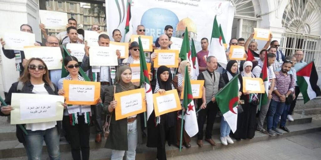 نظم صحفيون من مختلف المؤسسات الإعلامية، الثلاثاء، بدار الصحافة “طاهر جاووت” بالجزائر العاصمة، وقفة تضامنية مع الشعب الفلسطيني والصحفيين الفلسطينيين، الذين استشهدوا وهم ينقلون الحقيقة، في ظل ما يتعرضون له من قمع وعدوان خلال الحرب التي يشنها جيش الاحتلال الصهيوني على قطاع غزة منذ السابع من أكتوبر 2023.