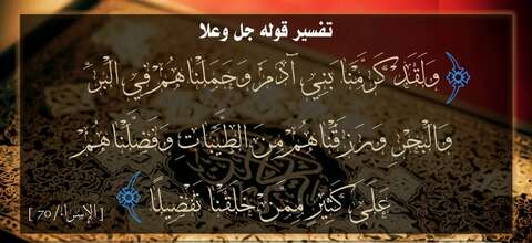 ومن تكريم الله تعالى للإنسان: أن جَعَلَه خليفةً في الأرض، وأسجدَ له الملائكة الكرام عليهم السلام، وسخَّر له ما في الكون جميعاً، فكانت بذلك النَّفس الإنسانيَّة أكرمَ المخلوقات في العالم كلِّه. والتَّكريم: جَعْلُه كريماً؛ أي: نَفِيساً غير مبذولٍ، ولا ذليلٍ في صورته، ولا في حركة مَشْيه وفي بشرته، فإنَّ جميع الحيوان لا يعرف النَّظافة ولا اللِّباس، ولا ترفيه المضجع والمأكل، ولا حُسْن كيفيَّة تناول الطَّعام والشَّراب، ولا الاستعداد لما ينفعه ودفع ما يضرُّه.