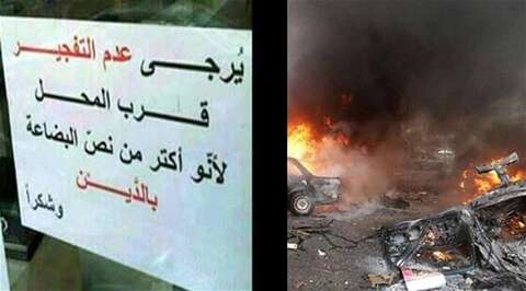 “نصف البضاعة بالدين.. الرجاء لا تفجر قرب المحل، نصف البضاعة بالدين.. الرجاء لا تفجر قرب المحل” هي لافتة علقها أحد الباعة في الضاحية الجنوبية لبيروت معتقداً أنه بهذه الطريقة سيحمي رزقه.