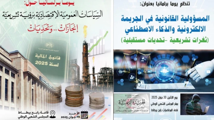 وبدورها ستنظم لجنة الشؤون القانونية والإدارية والحريات يوم الاثنين 30 جوان الجاري ابتداء من الساعة (09:00) صباحا، يوما برلمانيا ثانيا حول موضوع “الذكاء الاصطناعي والجريمة الإلكترونية”، وذلك بهدف تعميق النقاش حول التحديات القانونية الناشئة عن التطورات التكنولوجية والرقمية، وسبل التصدي لظواهر الجريمة الإلكترونية من منظور تشريعي ومؤسساتي.